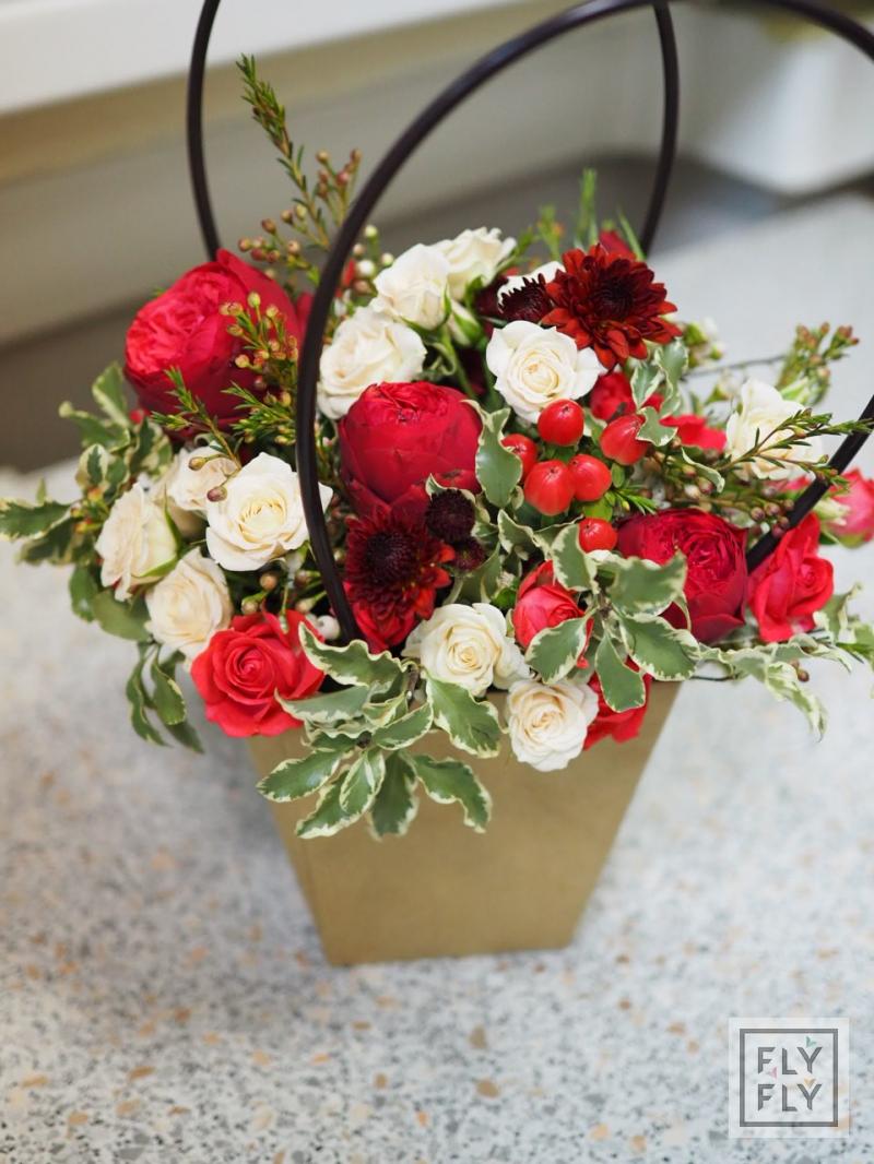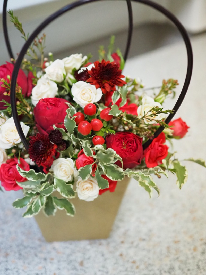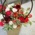 В составе: роза пионовидная сорта "Ред Пиано", роза кустовая, гиперикум, хамелациум, питоспорум, астра кустовая.
